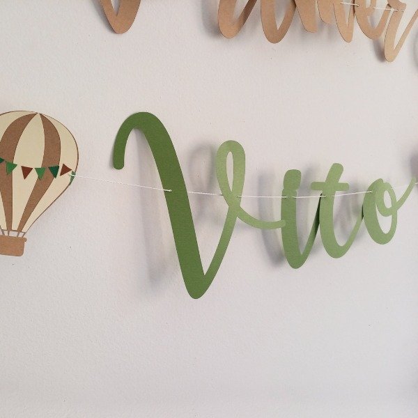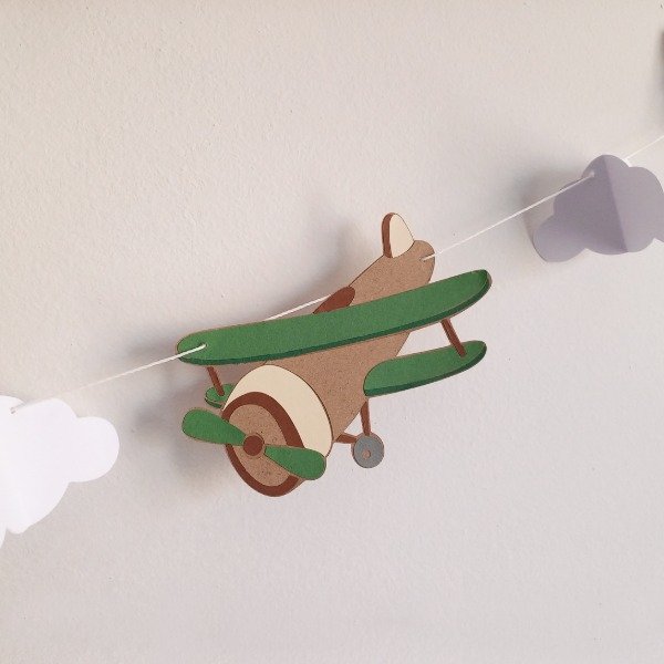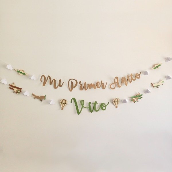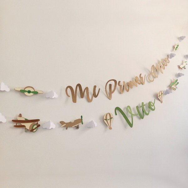 La guirnalda se personaliza con nombre y tiene imágenes de diferentes avionetas, intercaladas con nubes 3D y globos aerostáticos.
