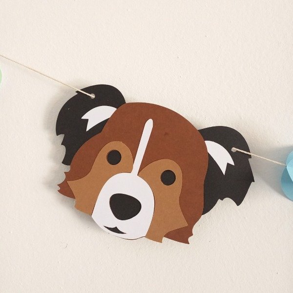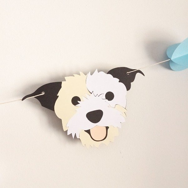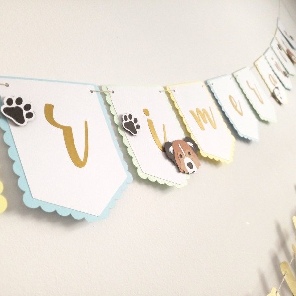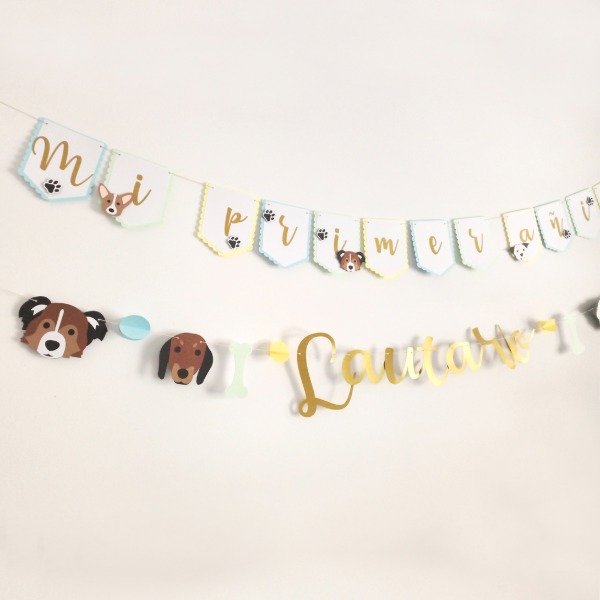 La guirnalda se personaliza con nombre y tiene imágenes de diferentes perritos, intercalados círculos 3D.